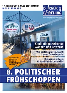 Der 8. Politische Frühschoppen der Bürger für Garching am 17. Februar 2019 im „Mei Wirtshaus“ in Hochbrück stand unter dem Motto „Konfliktlage zwischen Gewerbe und Wohnen – wie gestalten wir in Zukunft unser Gewerbegebiet“.