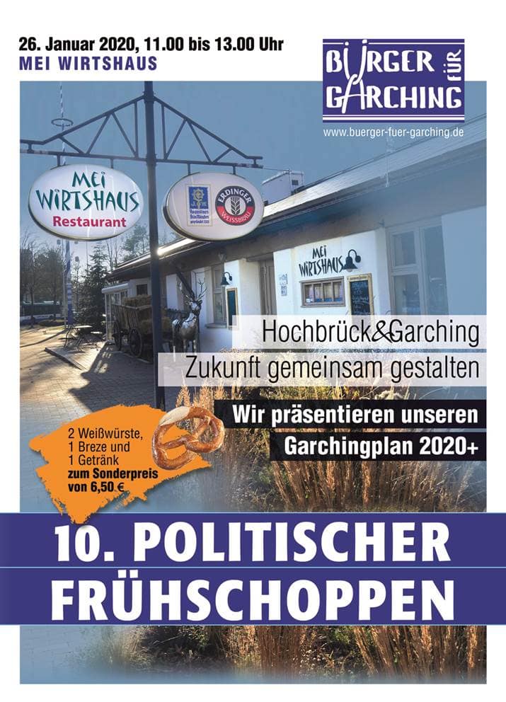 Am 26. Januar 2020 luden die Bürger für Garching zu ihrem 10. „Politischen Frühschoppen“ in Garching-Hochbrück im „Mei Wirtshaus“ und eine Woche später am 02. Februar in Garching im Cafe-Restaurant „Flamm´s zu ihrem 11 „Politischen Frühschoppen“ ein.